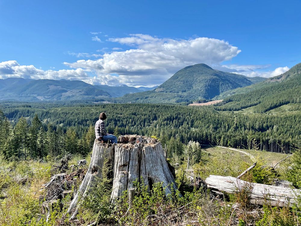 Sitting on an ancient stump near the Fairy Creek blockades, Pacheedaht Territory, Vancouver Island
