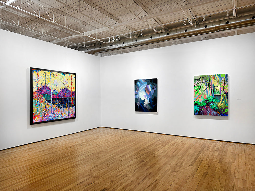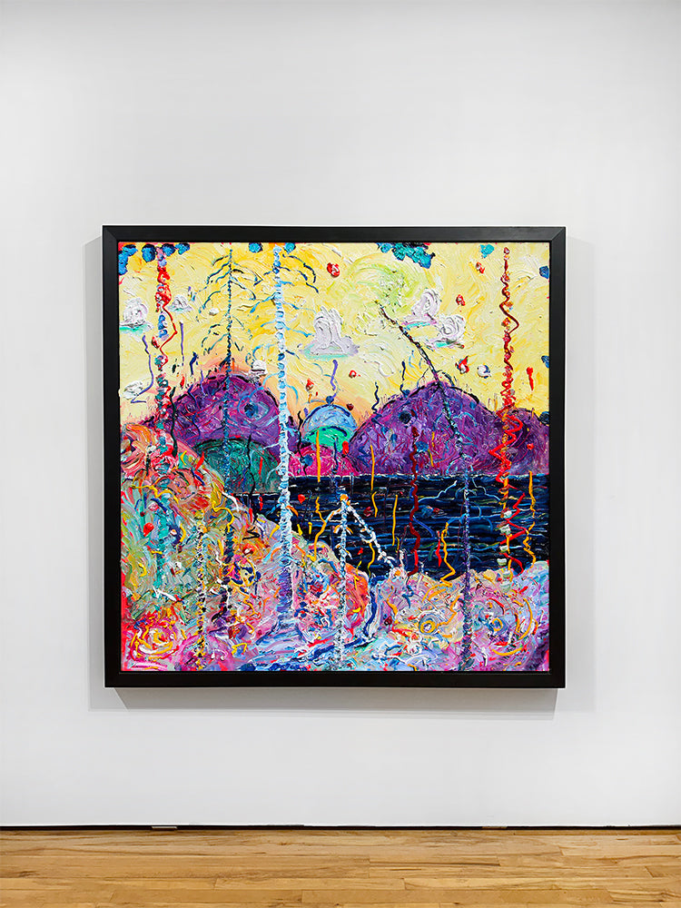Cameron's artworks are characterized by boldly coloured, thick paint. Often applied directly from the tube, the artist's glossy oil pigments create a three-dimensional effect on the canvas surface. Paintings are typically presented in a simple white floating frame.