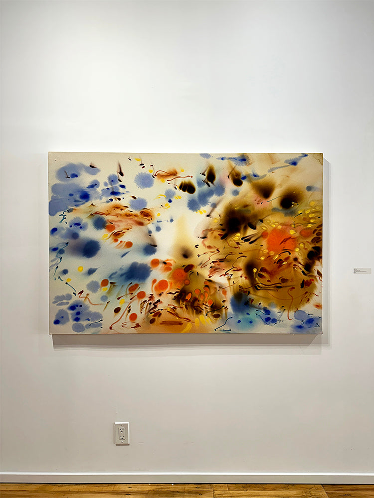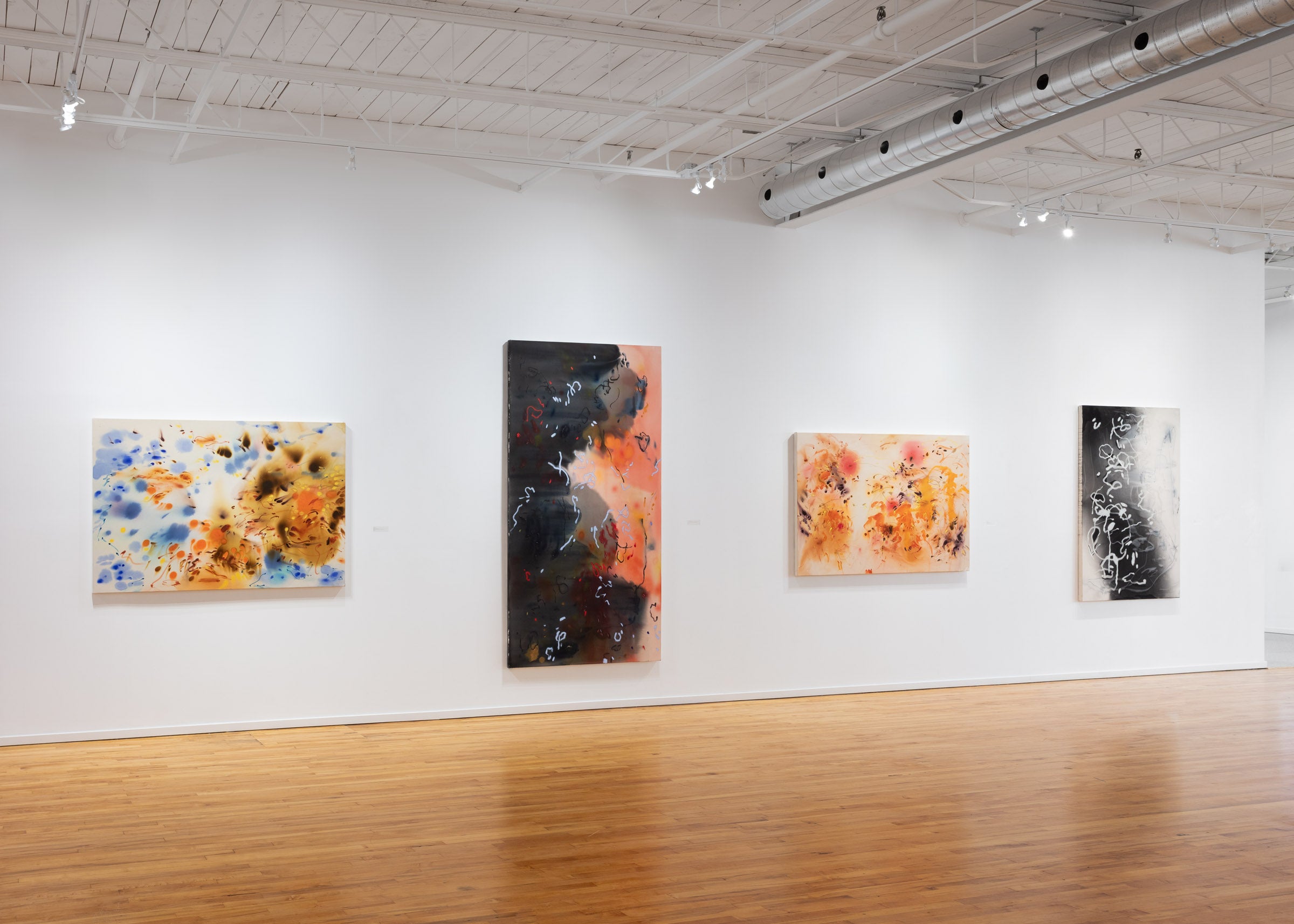 Lees utilizes raw canvas and intuitive applications of acrylic paint, ink, and oil stick.
