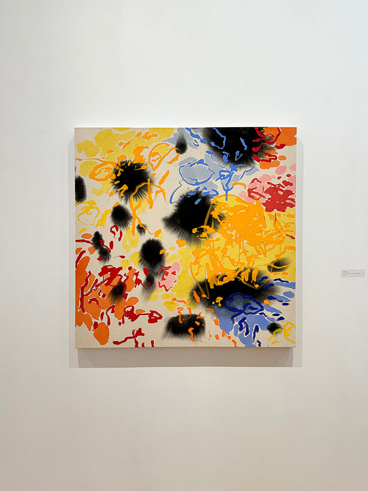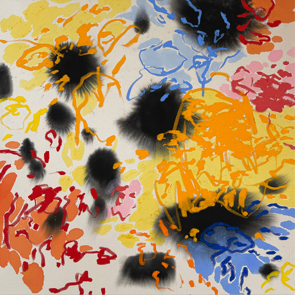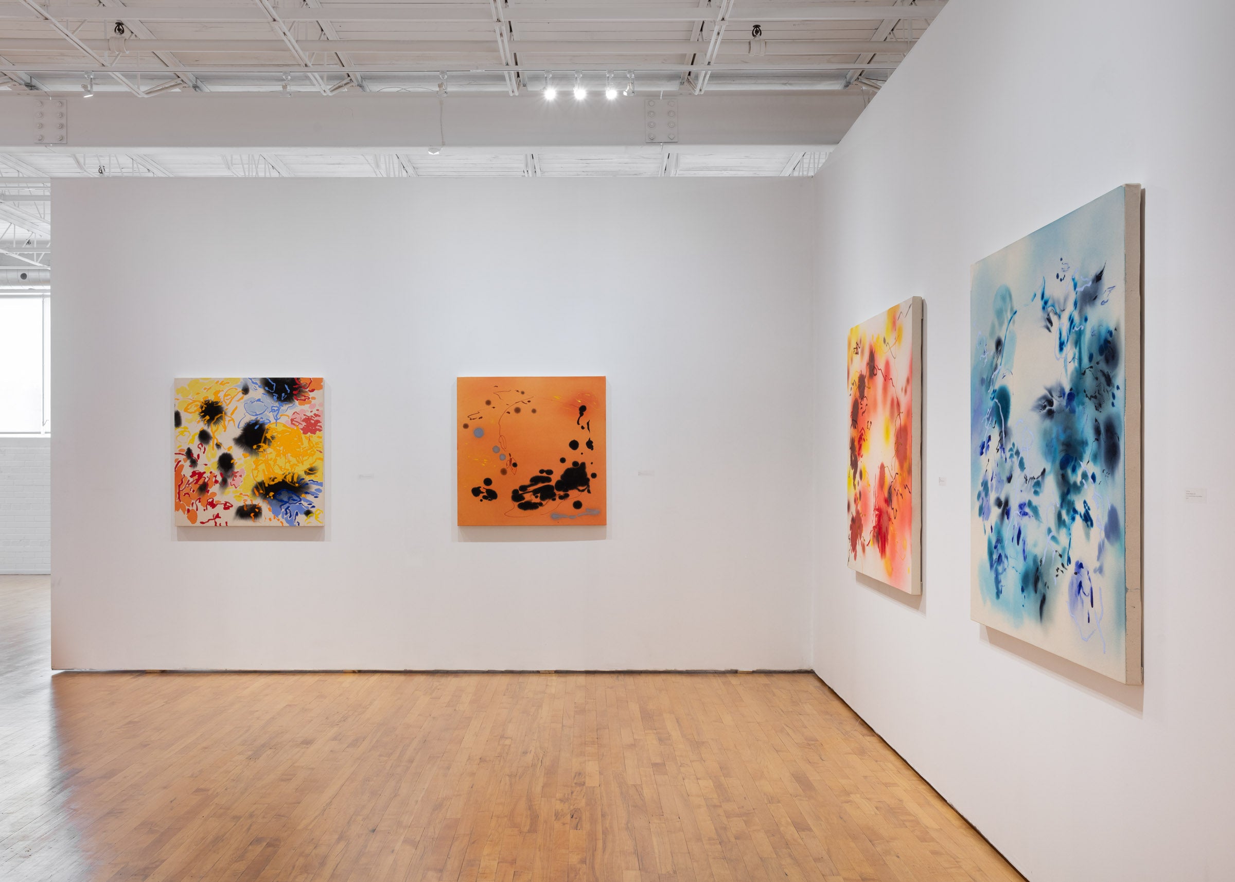 Lees utilizes raw canvas and intuitive applications of acrylic paint, ink, and oil stick.
