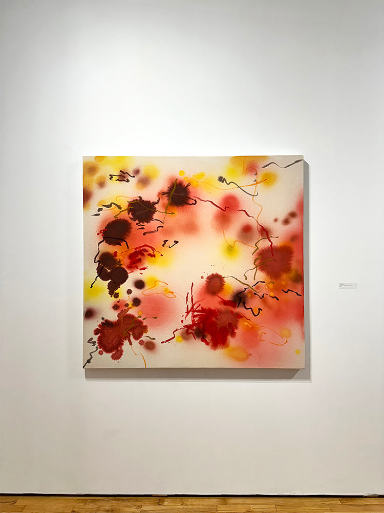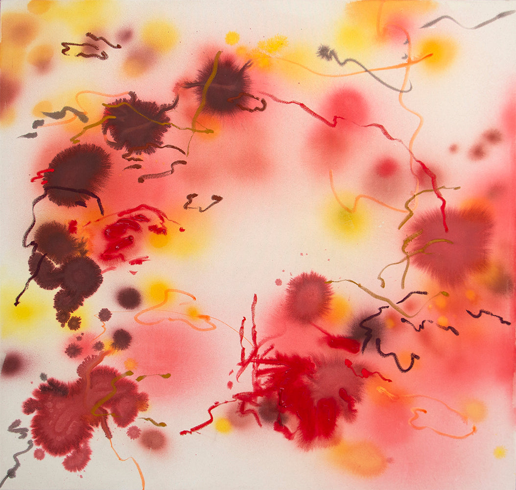 Lees utilizes raw canvas and intuitive applications of acrylic paint, ink, and oil stick.