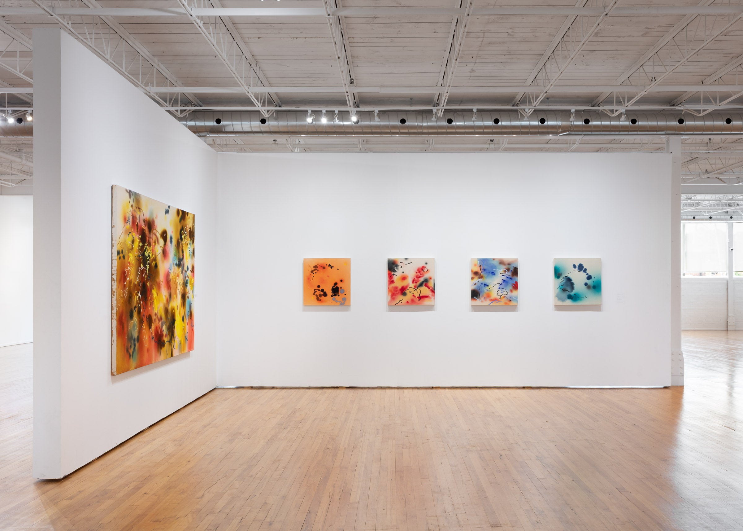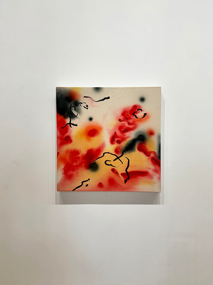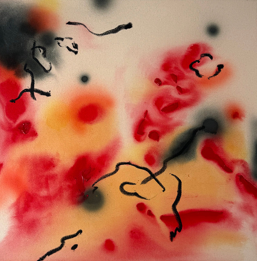 Lees utilizes raw canvas and intuitive applications of acrylic paint, ink, and oil stick.