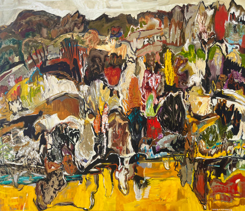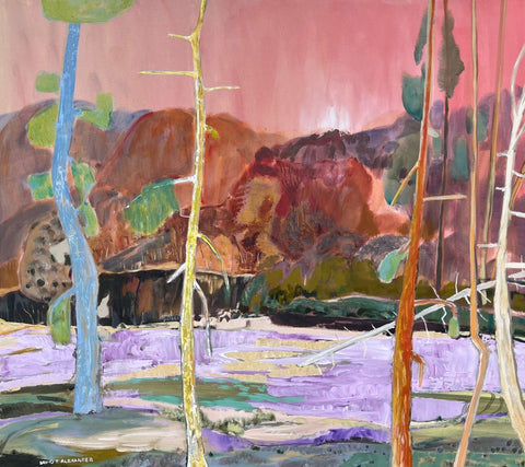 Alexander’s canvases exhibit high colour contrasts using a combination of dry and wet brushwork. Canvases display the artist’s gestural painting style, and have a matte finish. Paintings are ready to hang framed or unframed.