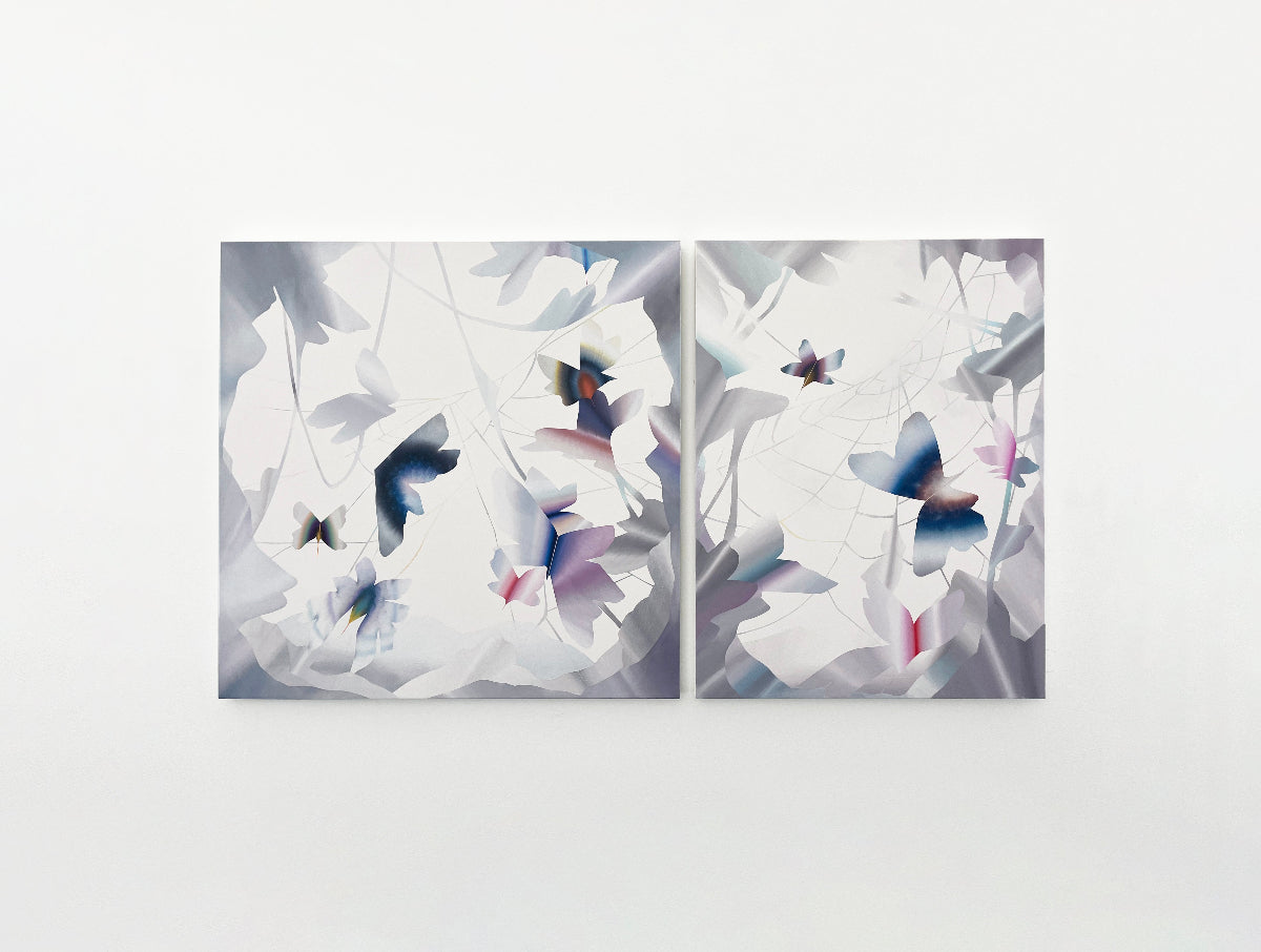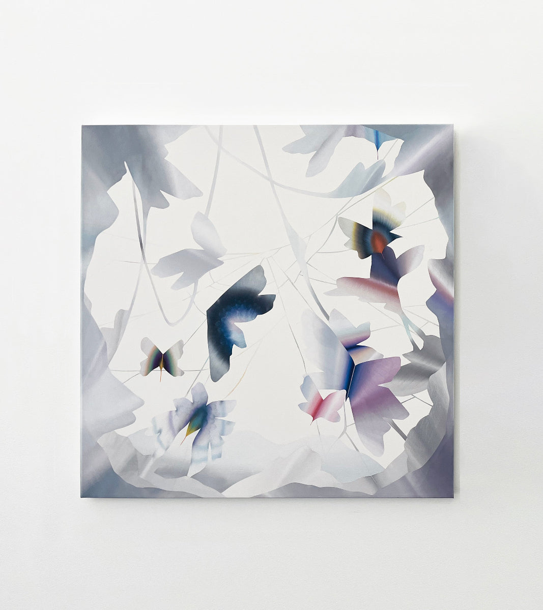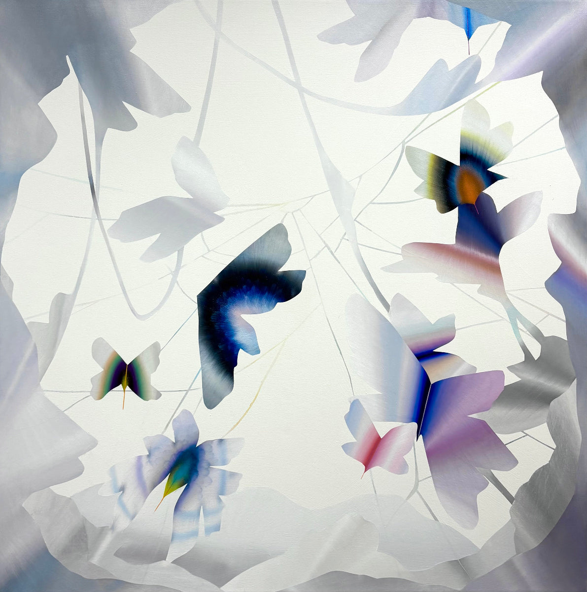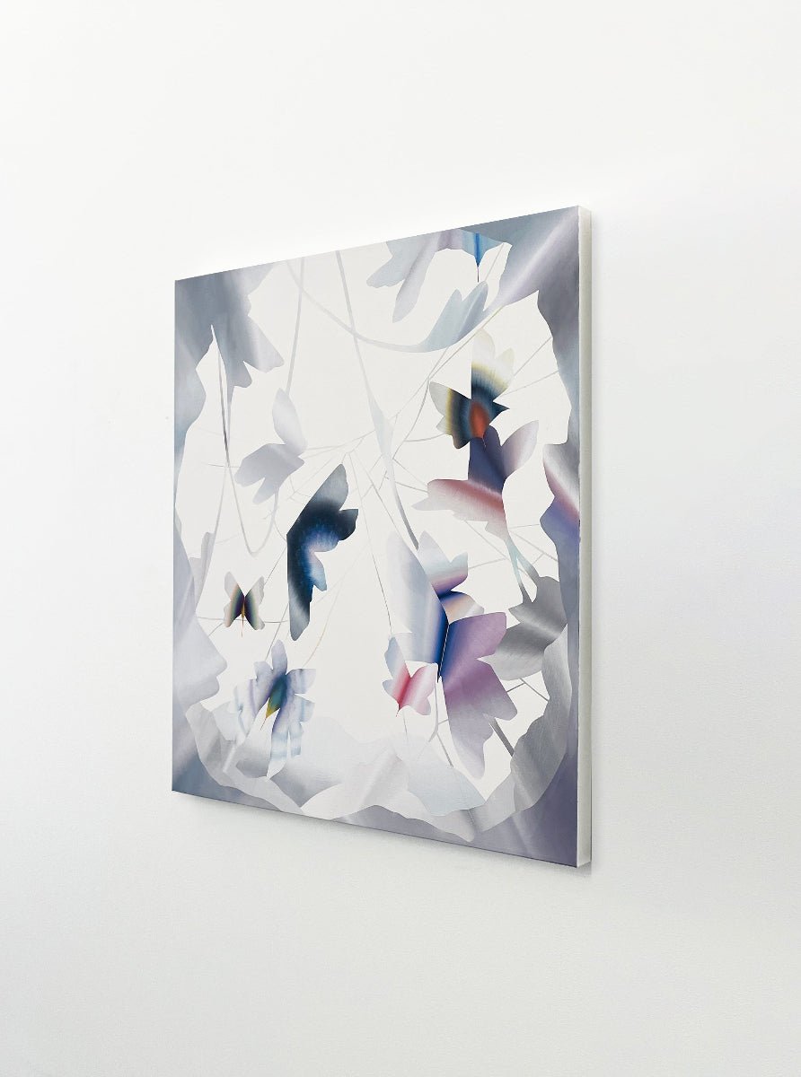 Louie's delicate yet dynamic abstract forms are composed of many thin layers of luminescent oil paint. Canvases have a smooth surface and can be hung framed or unframed.