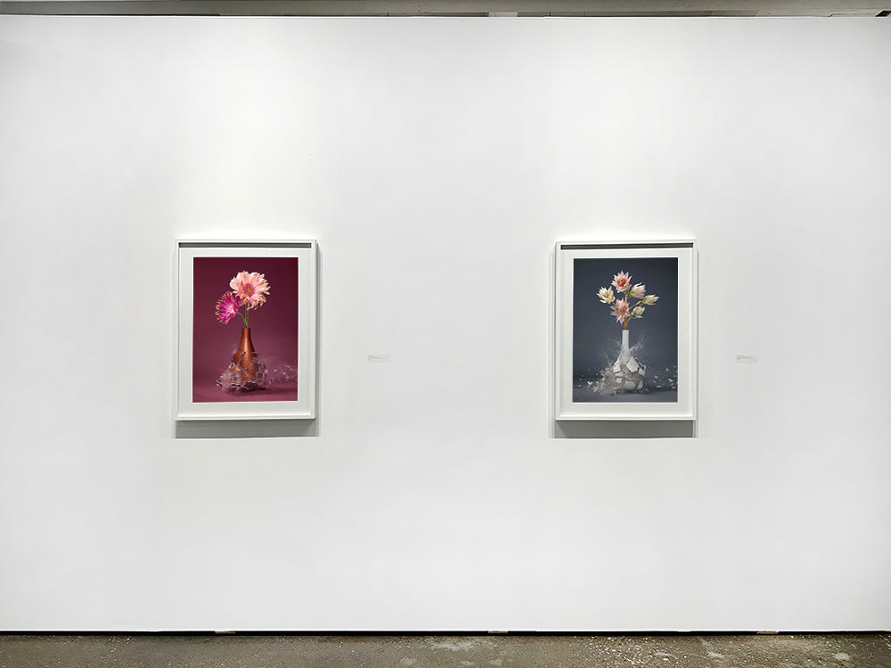 Klimas' dynamic compositions are captured using the latest technological advancements in high-speed photography. Works are printed with white borders then mounted to archival materials in the artist's Dusseldorf studio. They are framed with UV anti-reflective glass, or plexiglass; frames measure 0.75 inches wide and 2 inches deep.