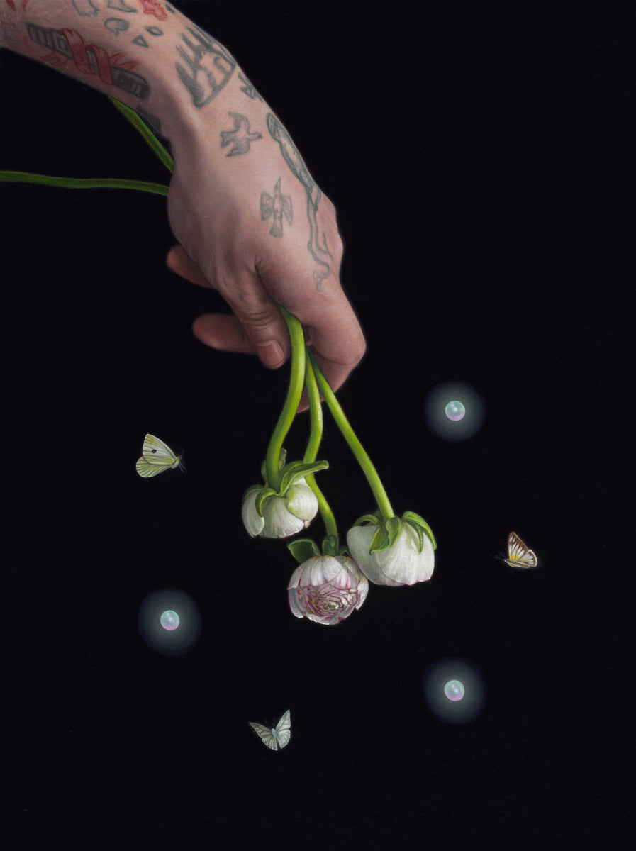 This painting introduces the body directly into the still life. A tattooed hand holds a small bouquet of peonies - flowers marked by contradiction. In many Eastern traditions, peonies are associated with masculinity and vitality; in Western contexts, they are linked to femininity and sincere regret. Held together, they reflect the unstable ways queer bodies have been named, disciplined, and desired.