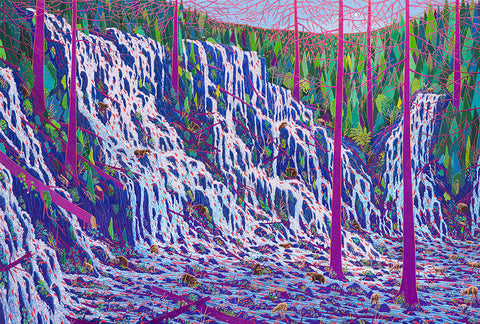 Kyle Scheurmann's works on paper are the documentations of our threatened landscapes that have undergone human-induced trauma. The artist's work is mixed media on paper, and characterized by his thoughtful palette and painterly approach; utilizing the subtle nuances of indigo, mauve and violet to great effect. Pieces are presented framed in White Oak with UltraVue70.