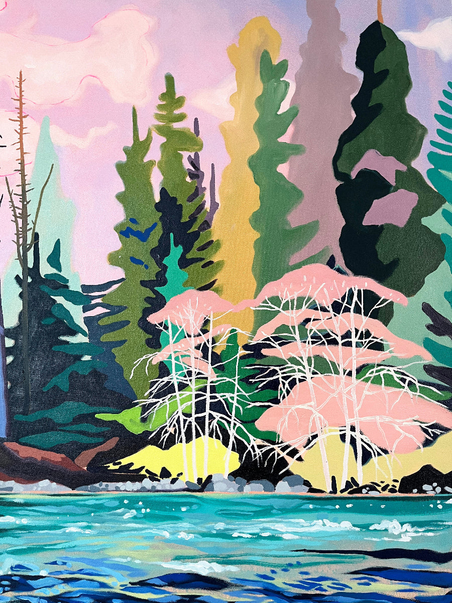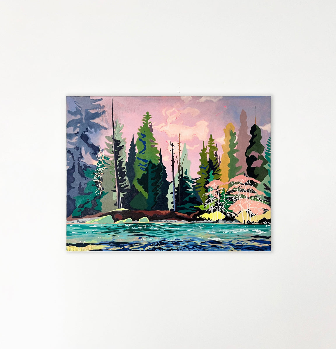"This piece [along with Wishing on Disappearing Stars] grew out of time spent at Stamp River. To reach the trails I walked through the quiet campground, where only a few men were camped alone. It made me acutely aware, as I often am when outdoors by myself, of that ingrained vigilance women carry. Still, I felt it was important to claim that space, to push against the discomfort and find a sense of belonging in it. And, of course, I couldn’t resist the pull of the fish ladder and the potential of seeing the salmon jump. " - Mel Gausden, 2025