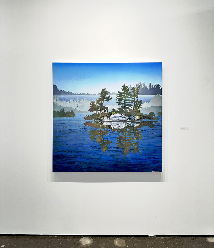 "Finding Even Ground explores the theme of balance through its layered perspective, featuring a harmonious composition of short horizon line trees and a striking tree island as its centerpiece. The delicate play between the blues of the background and the vibrant greens of the foreground trees is perfectly balanced, punctuated by the gentle rippling of water that forms a unique, pattern where no two ripples are alike. This piece invites viewers to appreciate the beauty in finding equilibrium amidst the various elements of nature." - Sheila Kernan