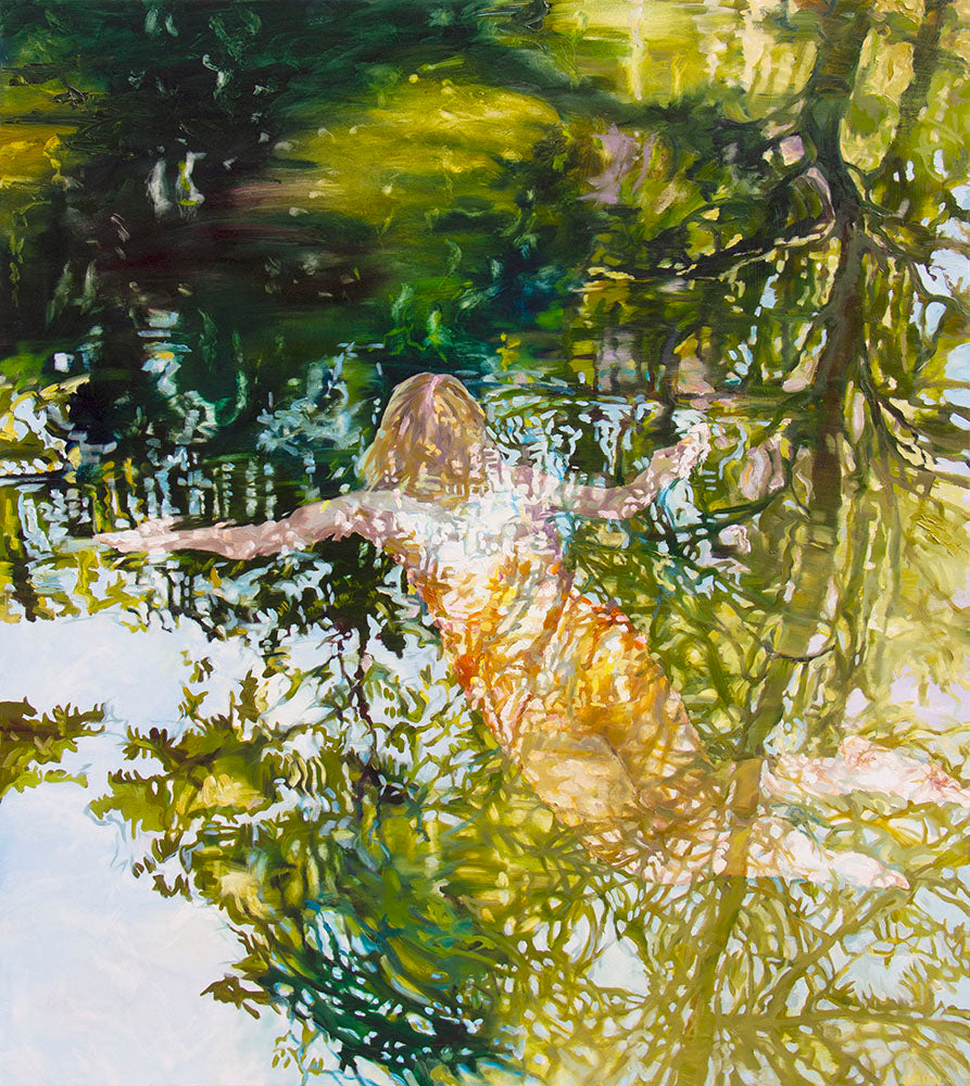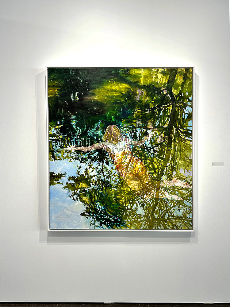 Known for her ability to capture the complexity of water, Smith works in many under-layers of paint to achieve effects of depth and movement. Blues are deep, saturated, and smoothly rendered to contrast the luminous texture and detail of her swimming figures. Paintings are in frames chosen by the artist.