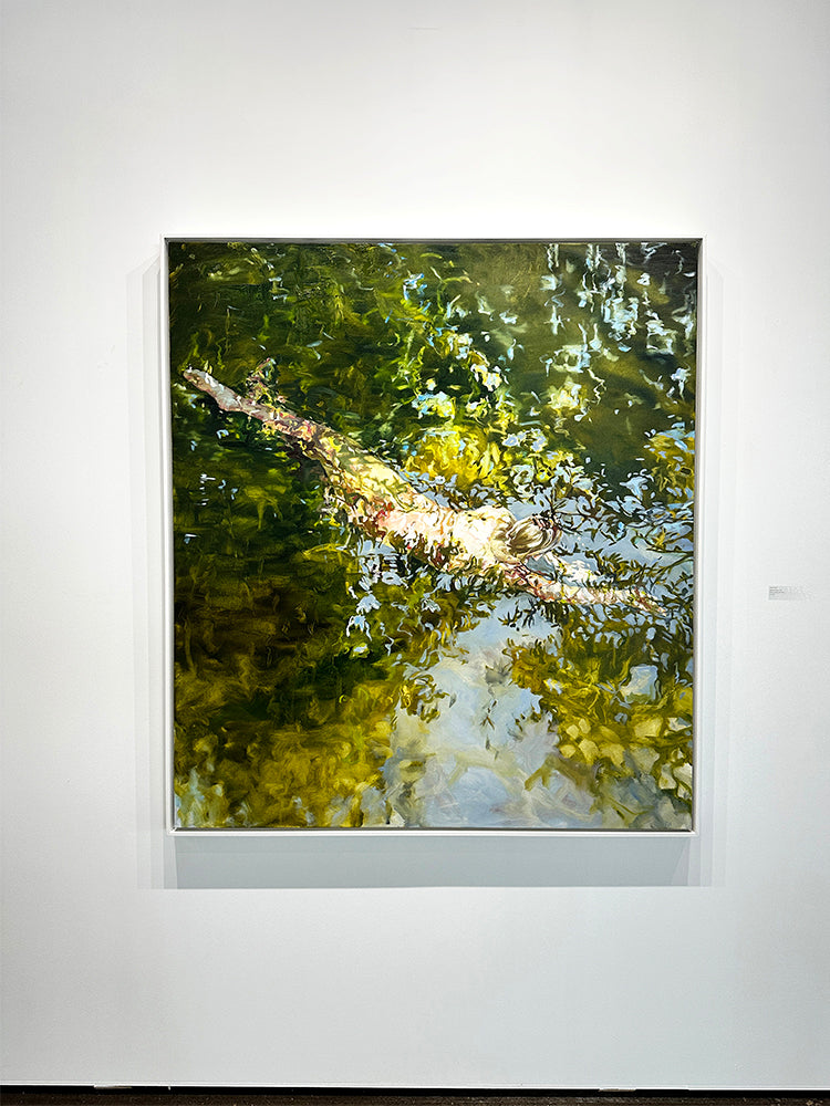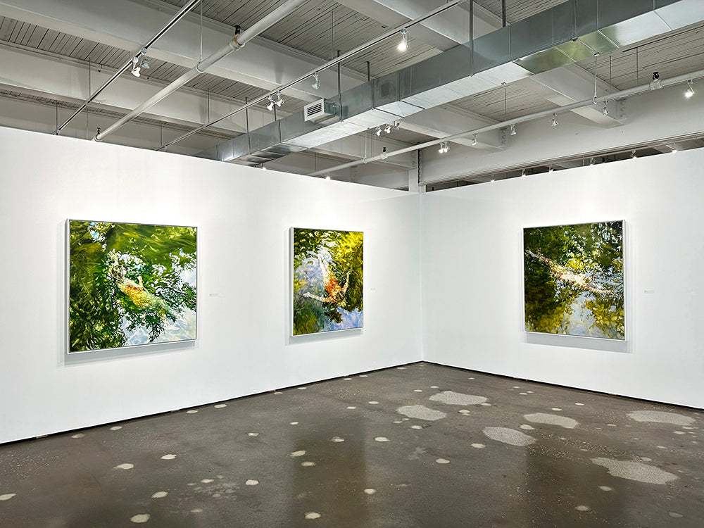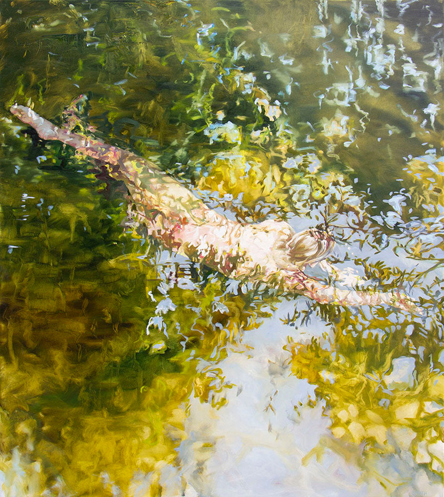 Known for her ability to capture the complexity of water, Smith works in many under-layers of paint to achieve effects of depth and movement. Blues are deep, saturated, and smoothly rendered to contrast the luminous texture and detail of her swimming figures. Paintings are in frames chosen by the artist.