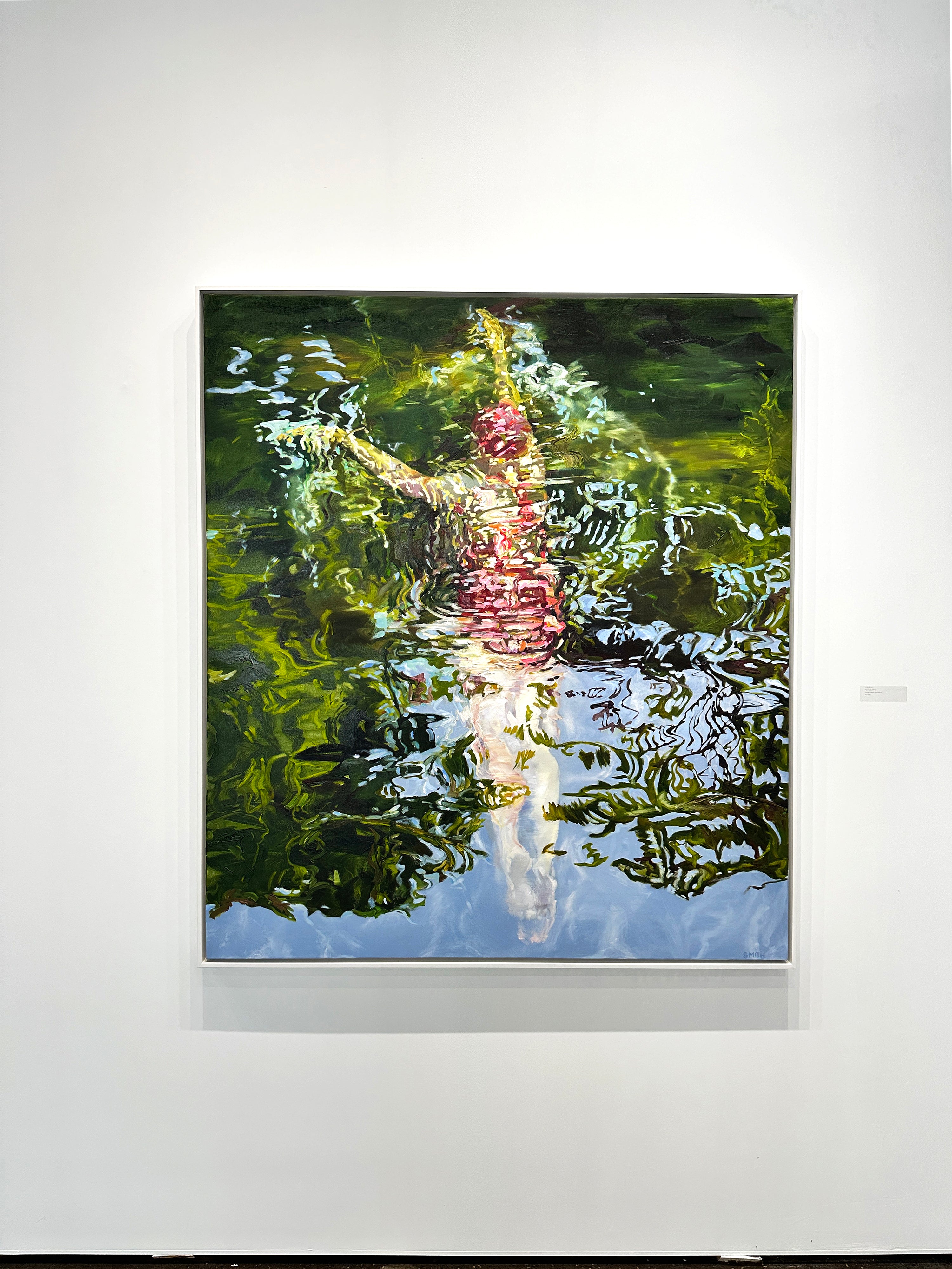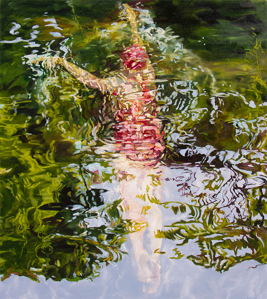 Known for her ability to capture the complexity of water, Smith works in many under-layers of paint to achieve effects of depth and movement. Blues are deep, saturated, and smoothly rendered to contrast the luminous texture and detail of her swimming figures. Paintings are in frames chosen by the artist.
