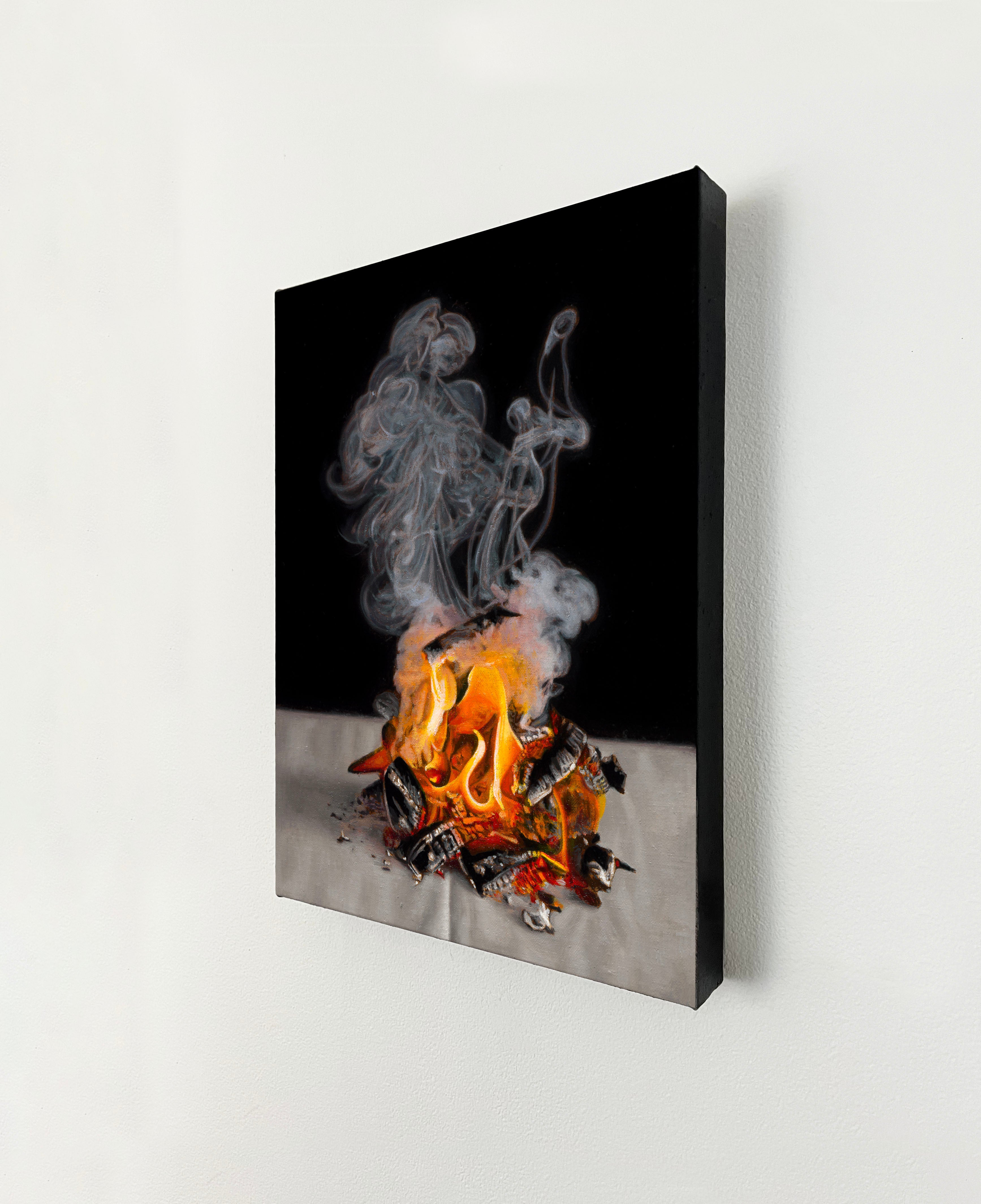 This painting centers on a small, contained fire resting on a table—neither spectacle nor catastrophe, but something held in suspension. The flames curl inward as much as they rise, while smoke gathers above them, folding back on itself and lingering in the air.