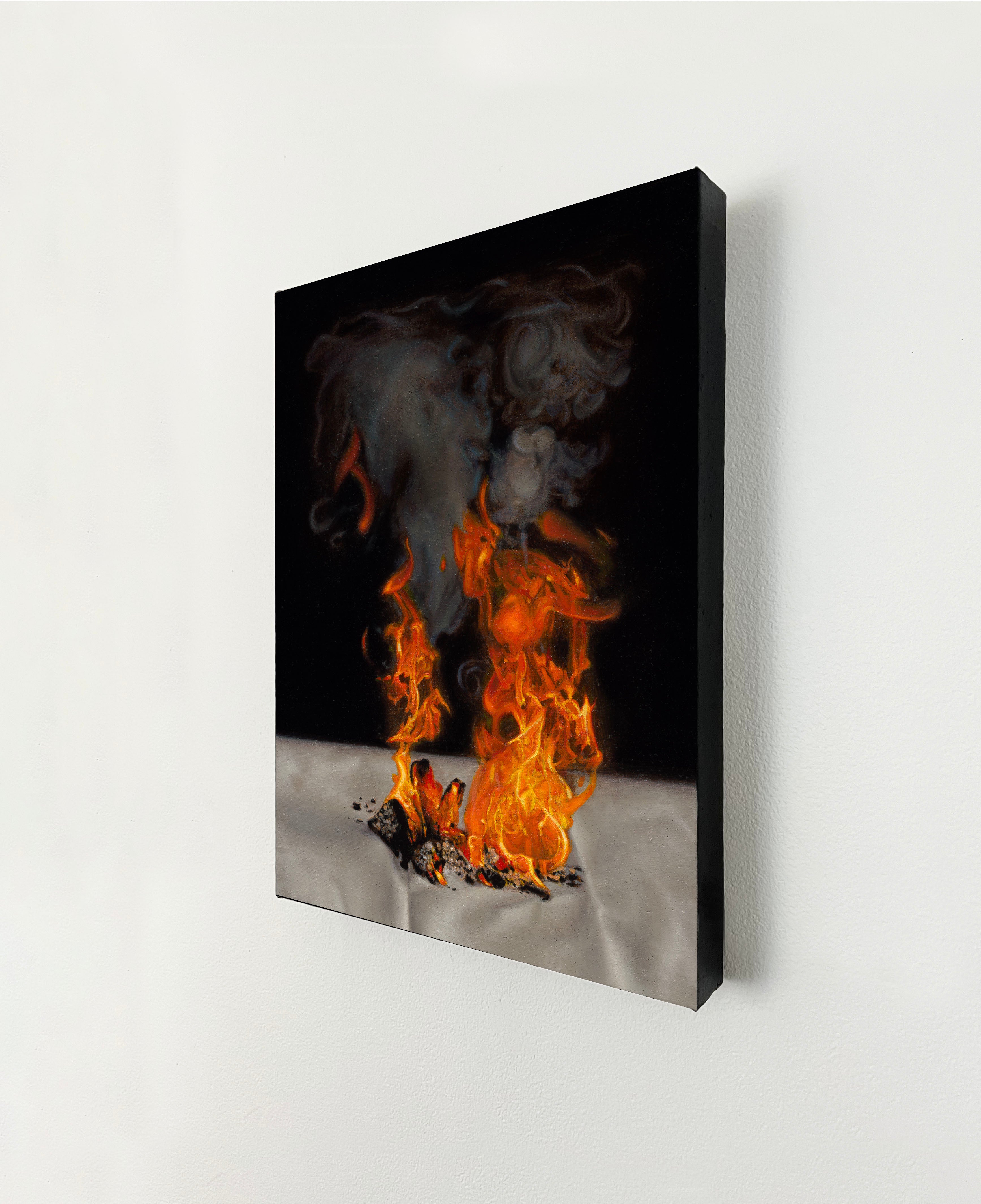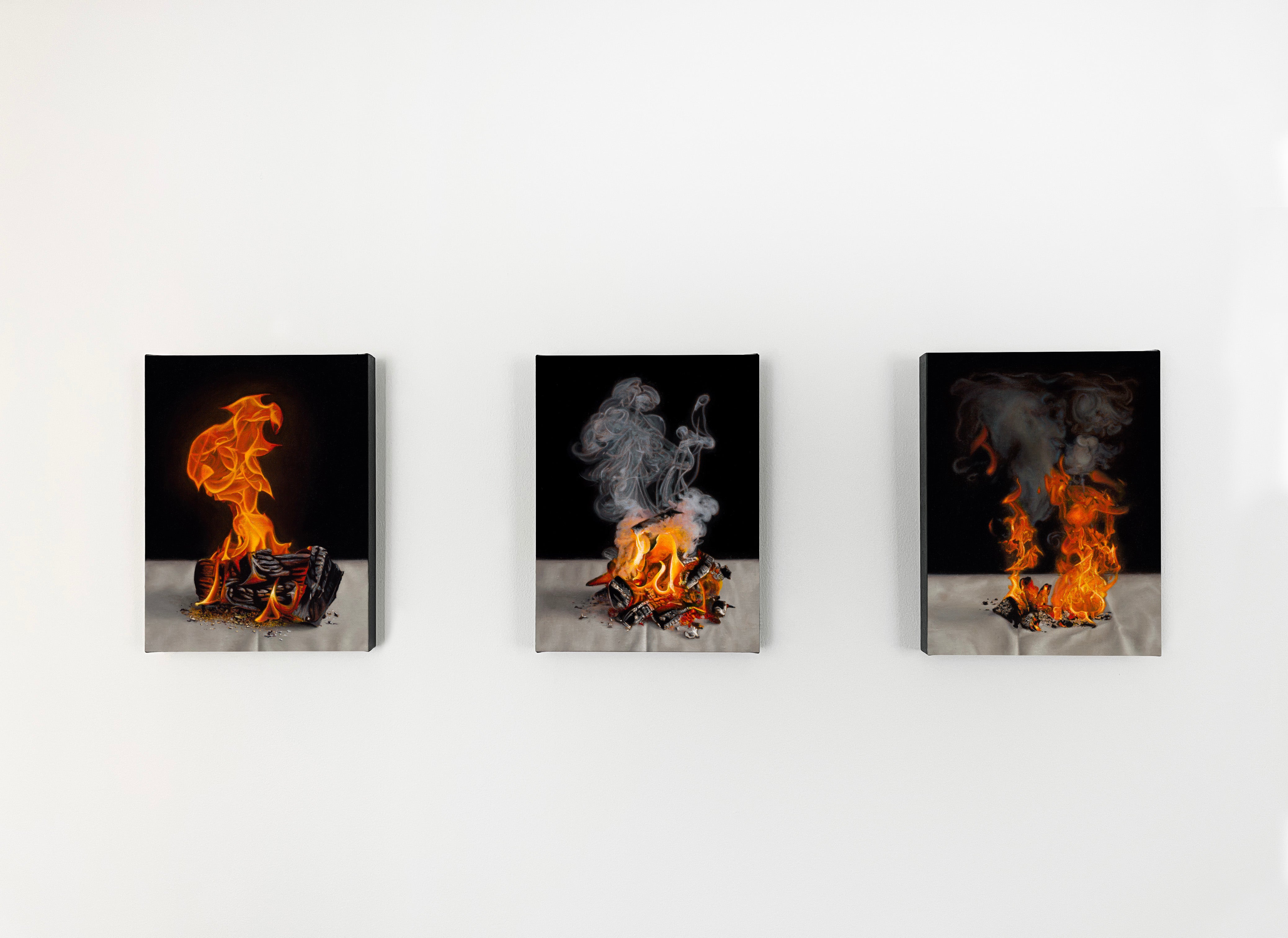 Fire burns on the table. Smoke rises, dense and unresolved. What is altered does not disappear—it changes form and persists. Burning has long been used as a language of erasure. Here it fails. Ash remains. Heat lingers. The air carries what cannot be undone.