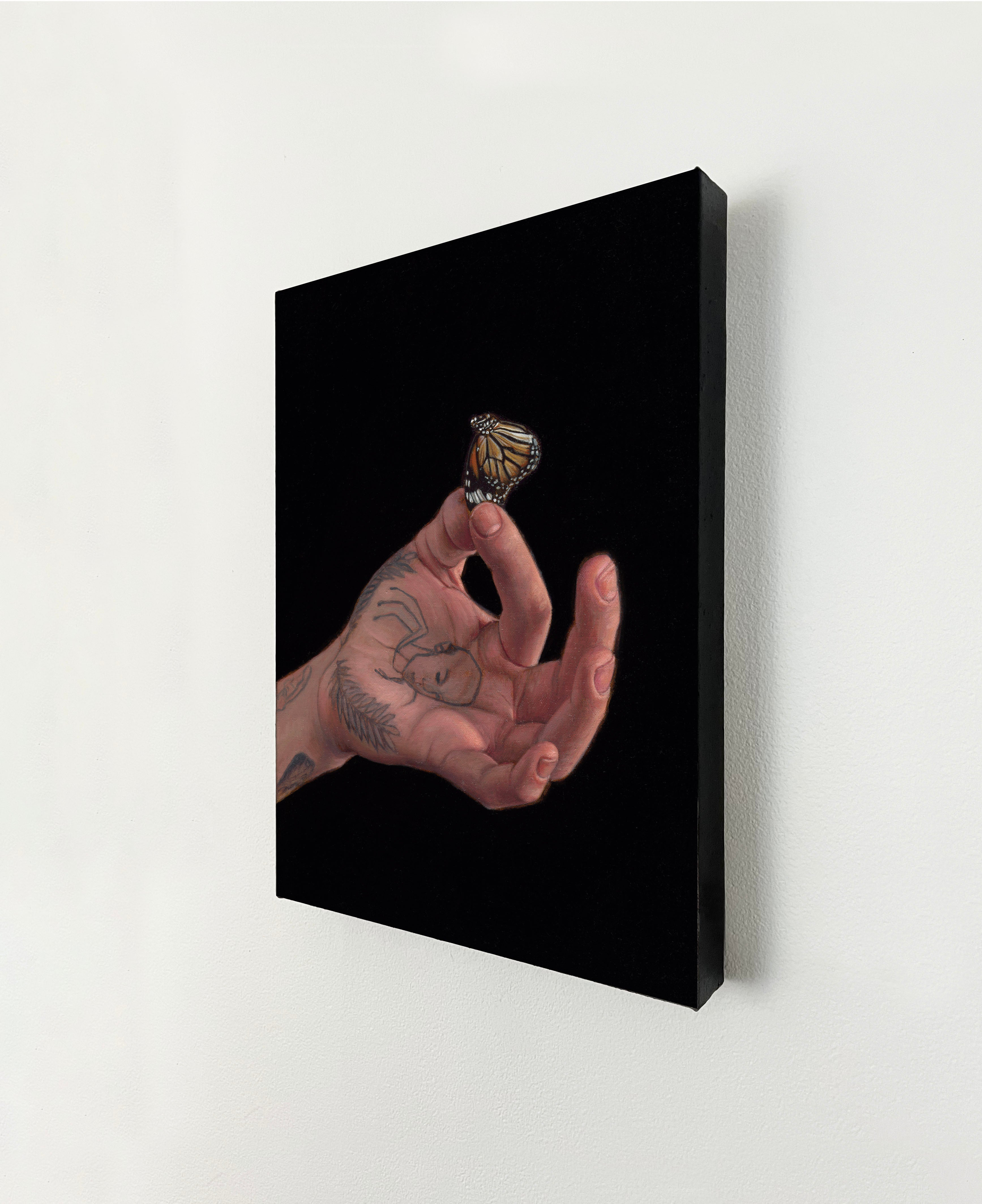 This hand belongs to the present. It carries marks of a life lived after what has already happened, after the history that names the butterfly and stains it. To hold it now is not an act of discovery, but of recognition. The hand knows what this body has meant, how it has been used, and what it has survived. There is no way to touch this history without altering it. The truth cannot be handled lightly, nor can it be released without consequence. What is fragile here is not only the butterfly, but the distance between knowing and harming, between care and inevitability.