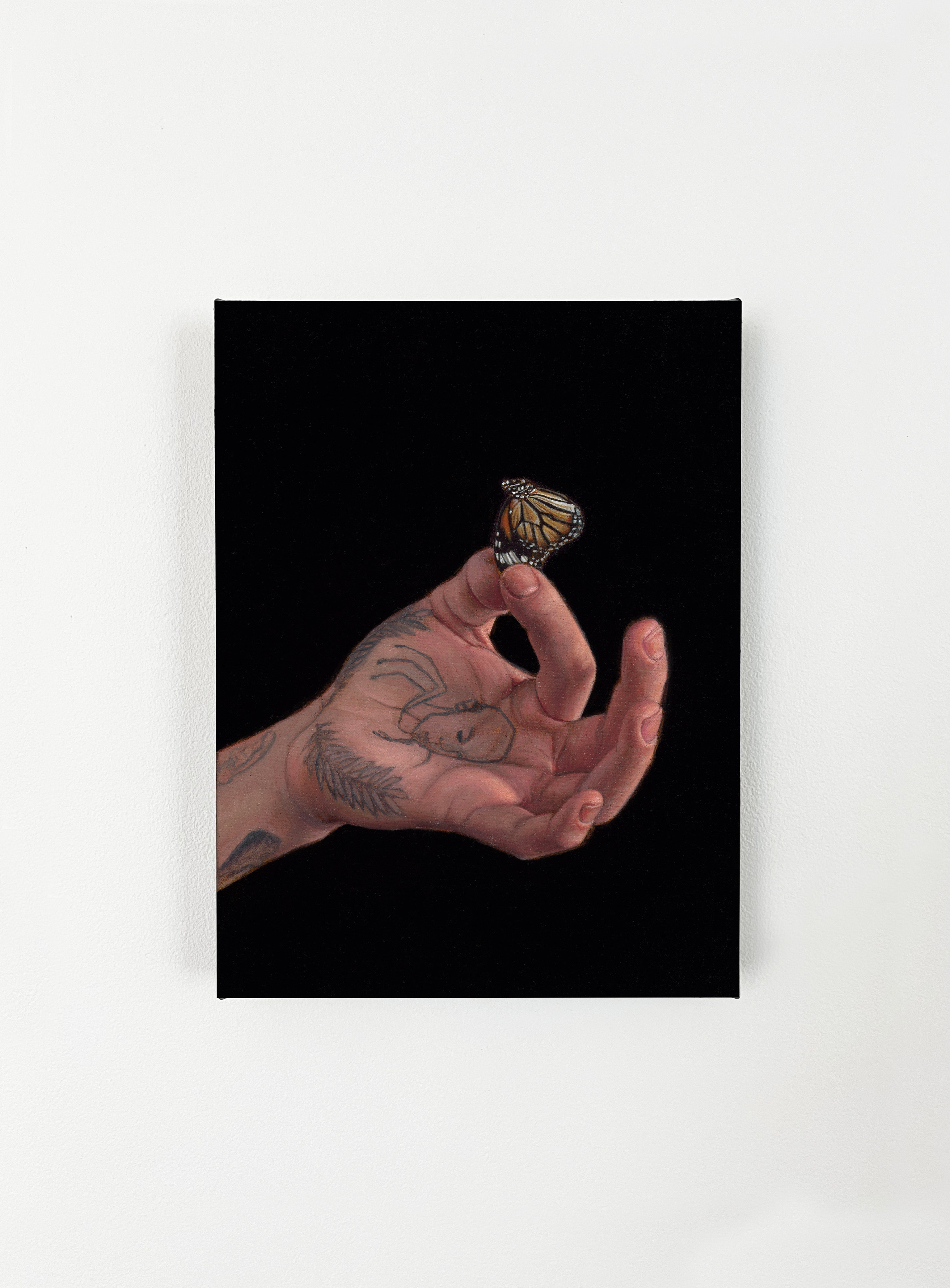 A tattooed hand holds a butterfly delicately between thumb and forefinger. The gesture is careful, practiced, intimate. It knows exactly how much pressure is being applied.