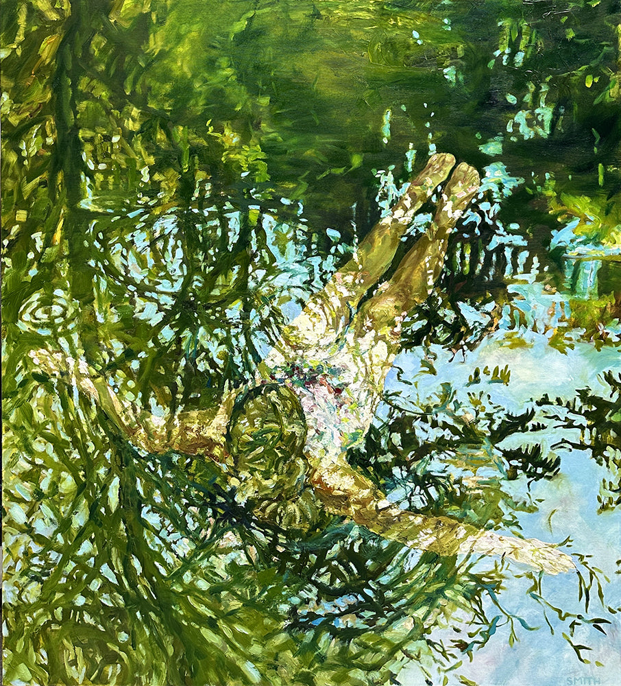 Known for her ability to capture the complexity of water, Smith works in many under-layers of paint to achieve effects of depth and movement. Blues are deep, saturated, and smoothly rendered to contrast the luminous texture and detail of her swimming figures. Paintings are in frames chosen by the artist.