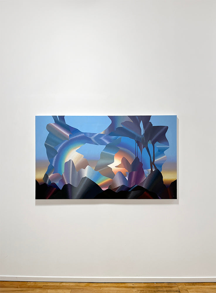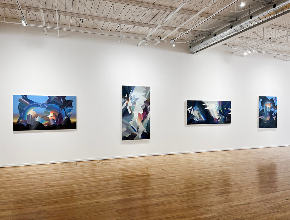 Louie's delicate yet dynamic abstract forms are composed of many thin layers of luminescent oil paint. Canvases have a smooth surface and can be hung framed or unframed.