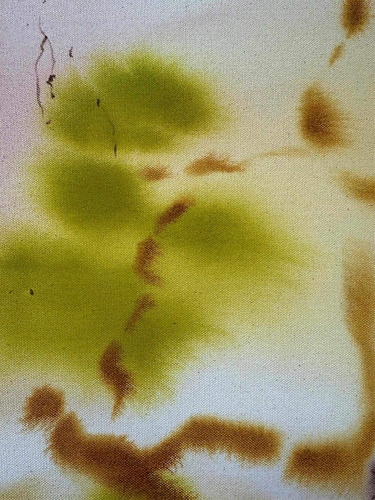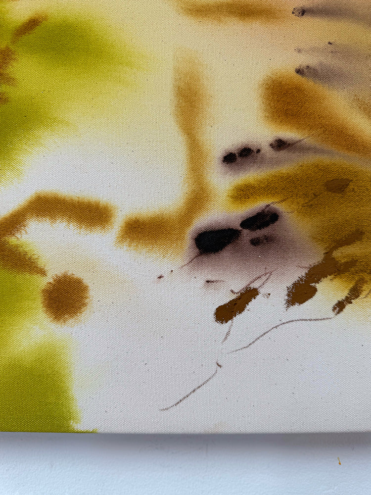 Lees utilizes raw canvas and intuitive applications of acrylic paint, ink, and oil stick.