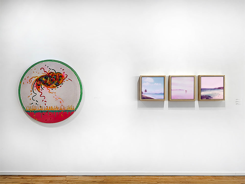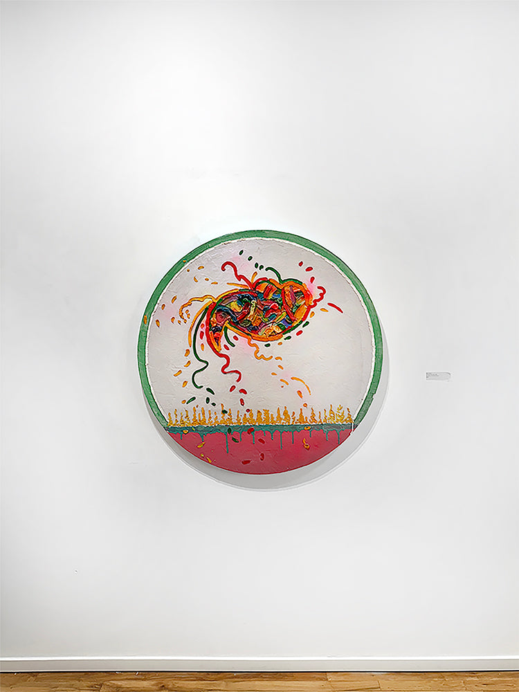Cameron's artworks are characterized by boldly coloured, thick paint. Often applied directly from the tube, the artist's glossy oil pigments create a three-dimensional effect on the canvas surface.