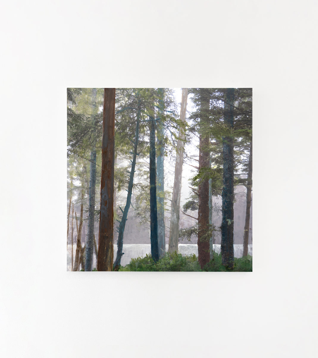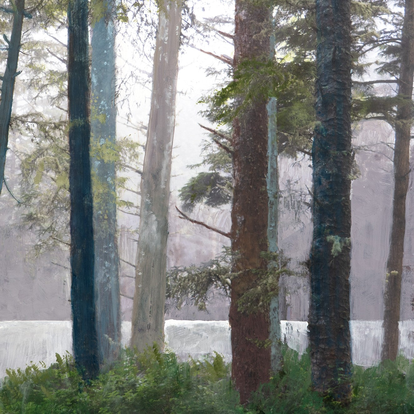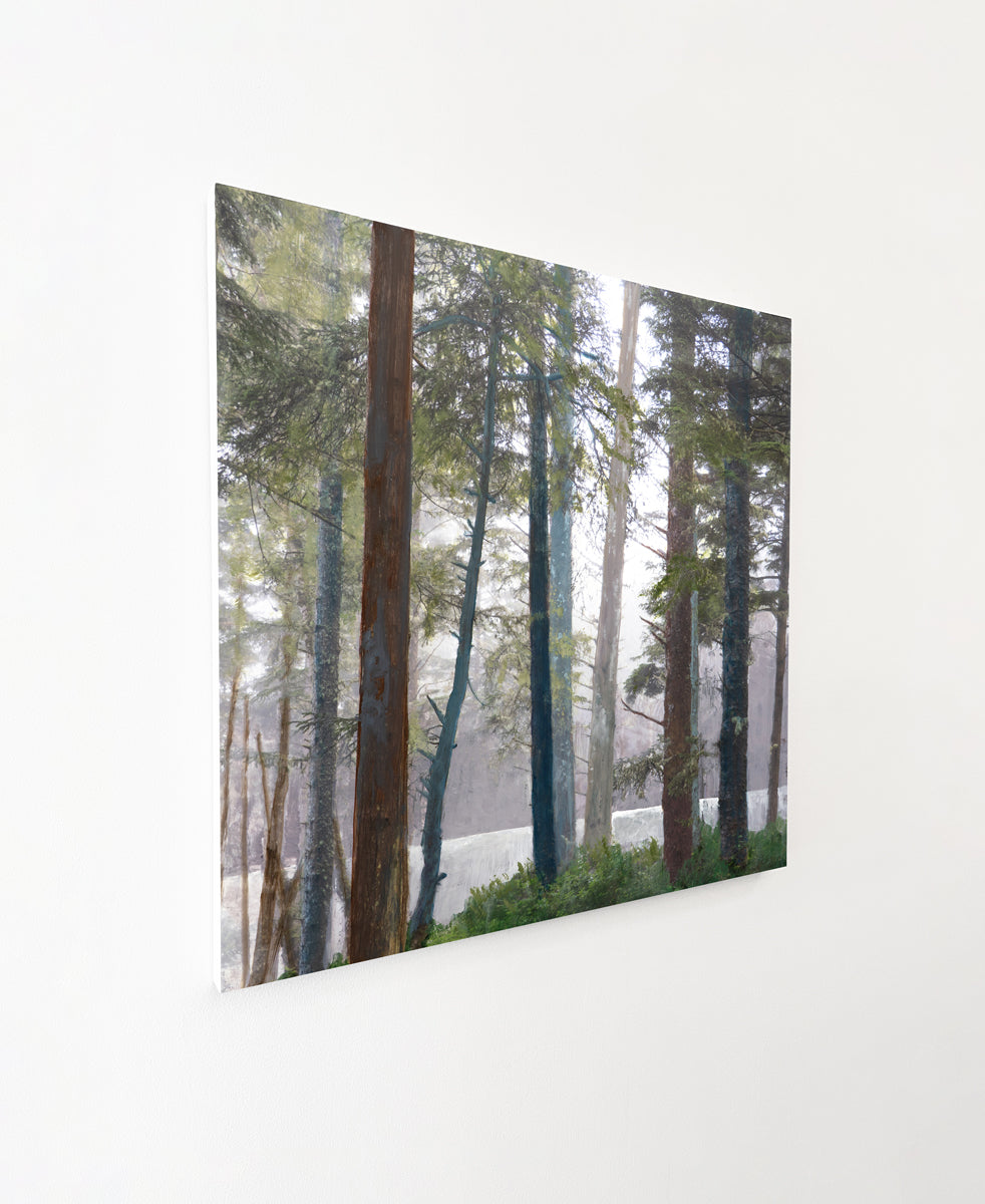 Nederveen's panels incorporate imagery from personal landscape and architectural photos into painted and stained panels. Works are finished with a satin varnish that allows areas of textured paint to show through, revealing evidence of the artist's process.