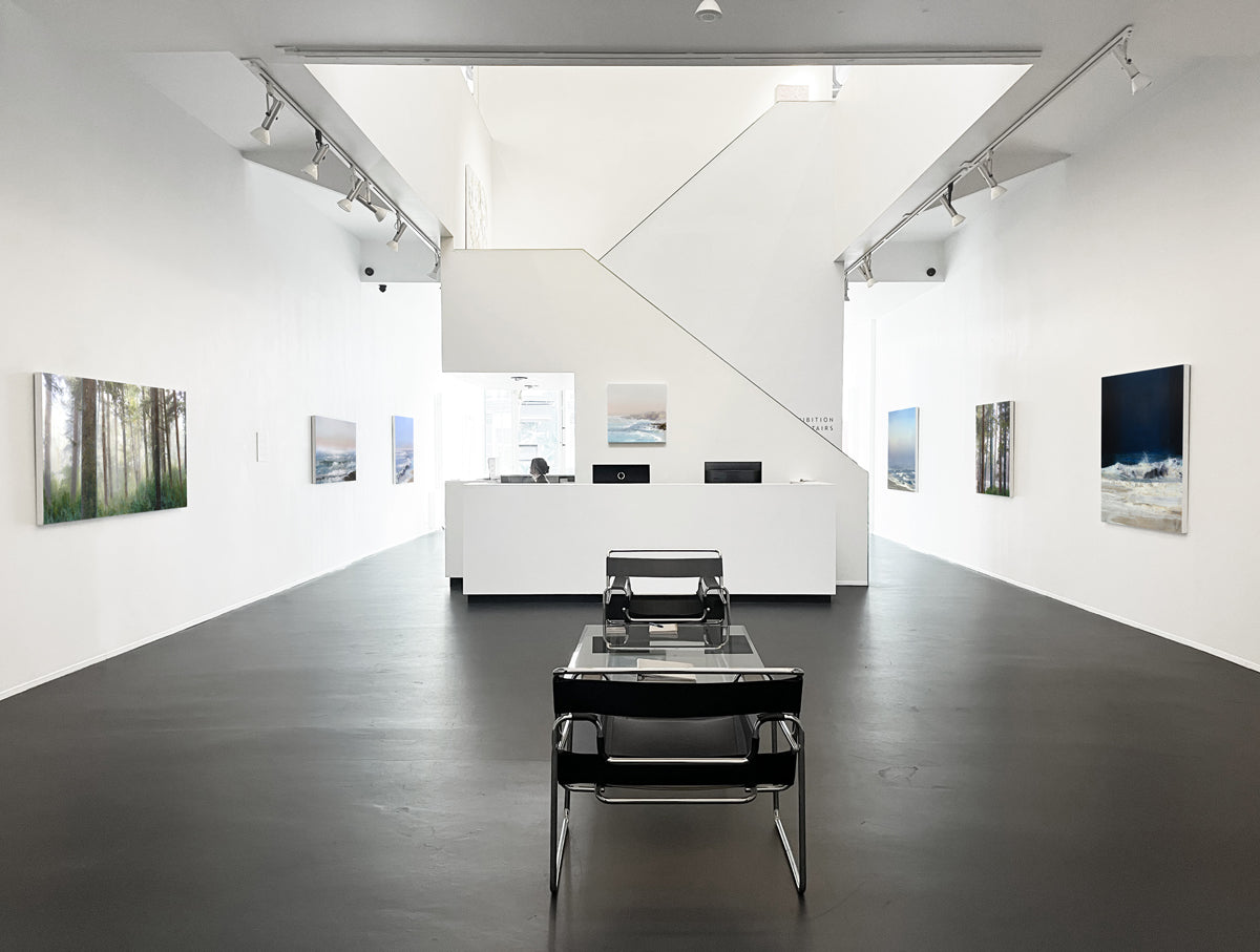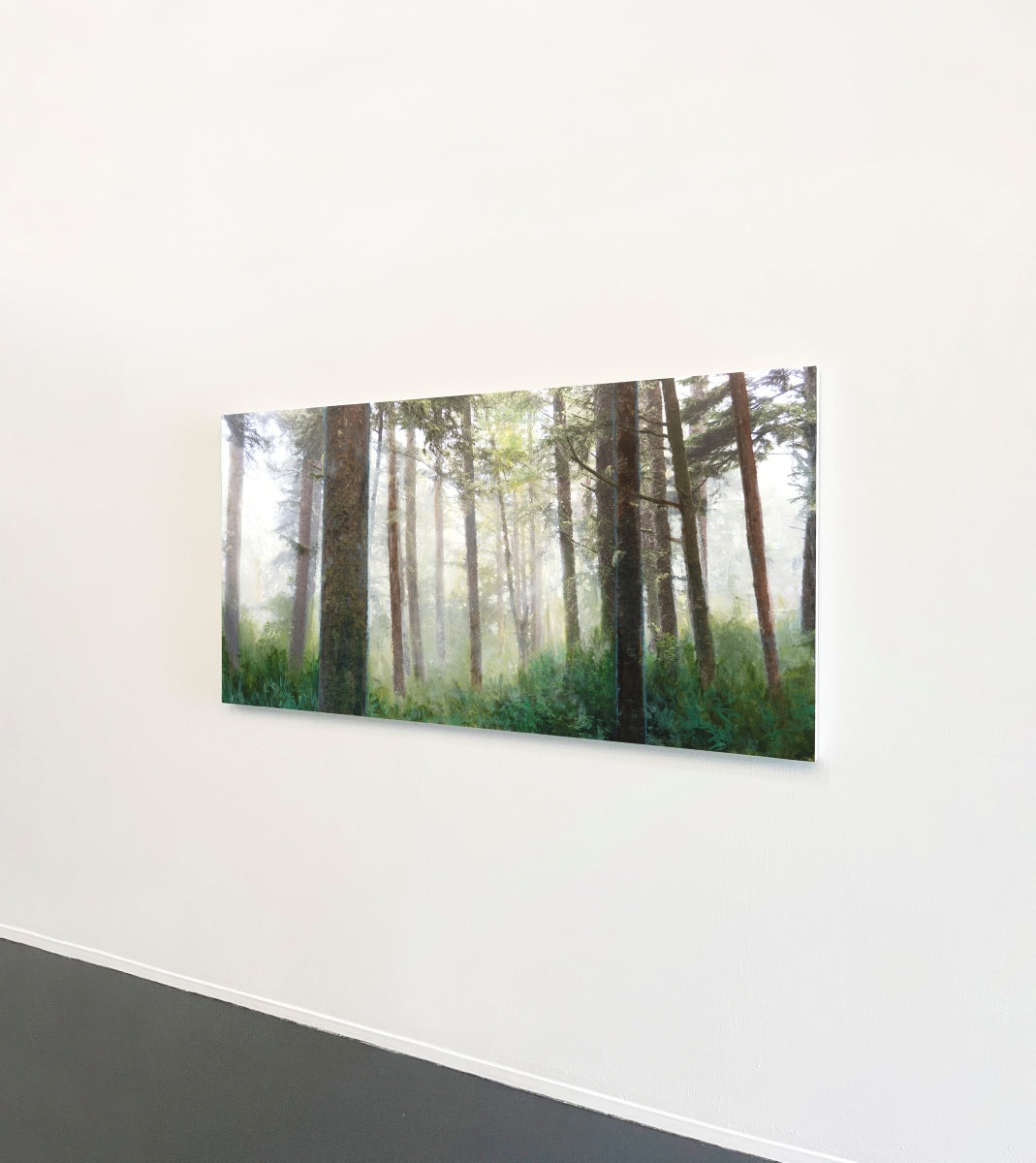 Nederveen's panels incorporate imagery from personal landscape and architectural photos into painted and stained panels. Works are finished with a satin varnish that allows areas of textured paint to show through, revealing evidence of the artist's process.