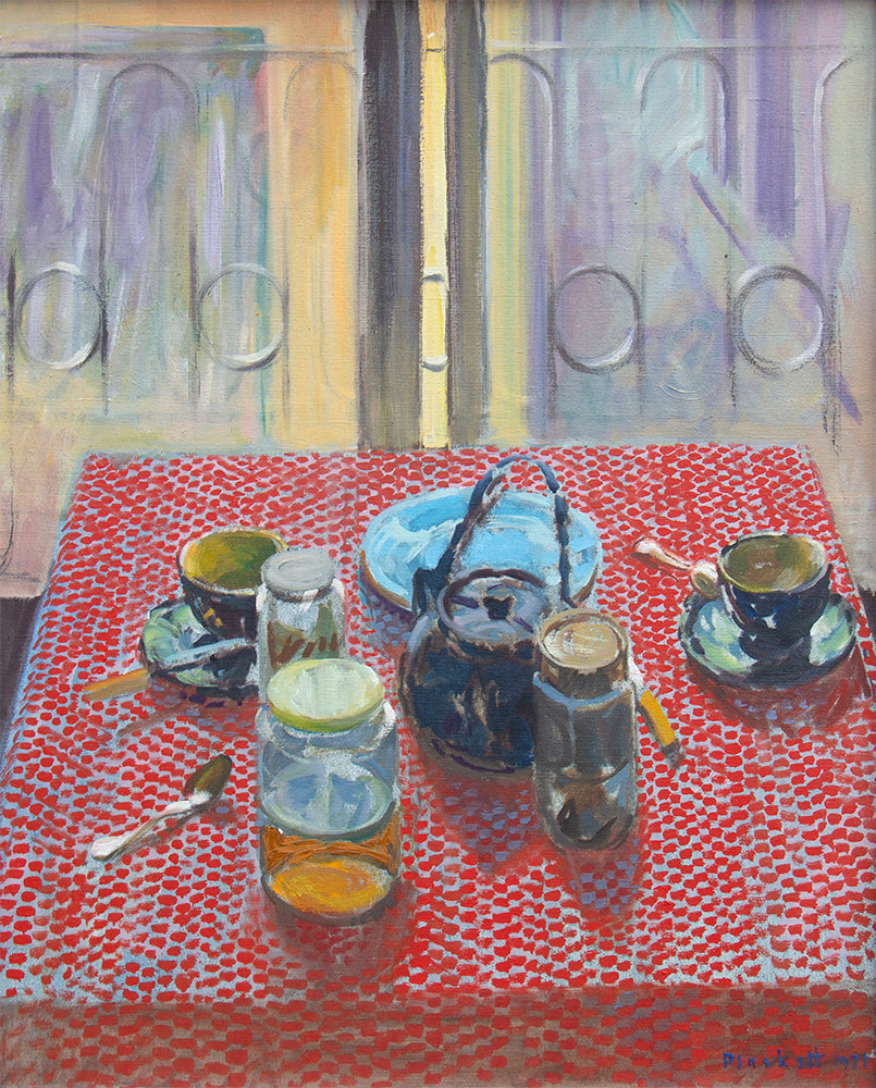 Plaskett's works on canvas are painted in the artist's signature, post-Impressionist style characterized by textured oil application and pastel hues. These historical pieces have a matte finish, and are traditionally framed.